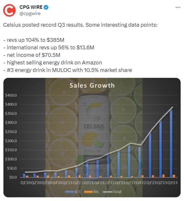 🧃 Energy drink brand Celsius posts crazy Q3 revenue, continuing explosive growth