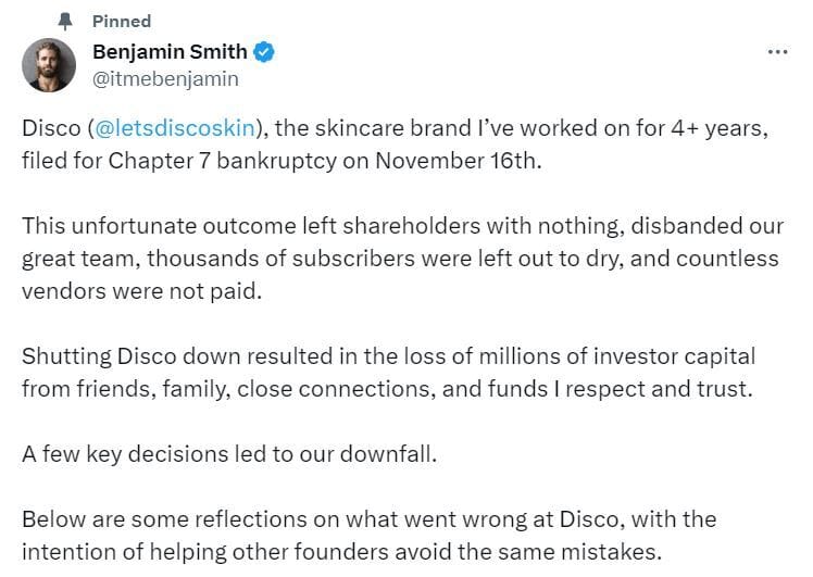 📈 Men’s skincare brand Disco files for bankruptcy. Founder Benjamin Smith shares the full story.